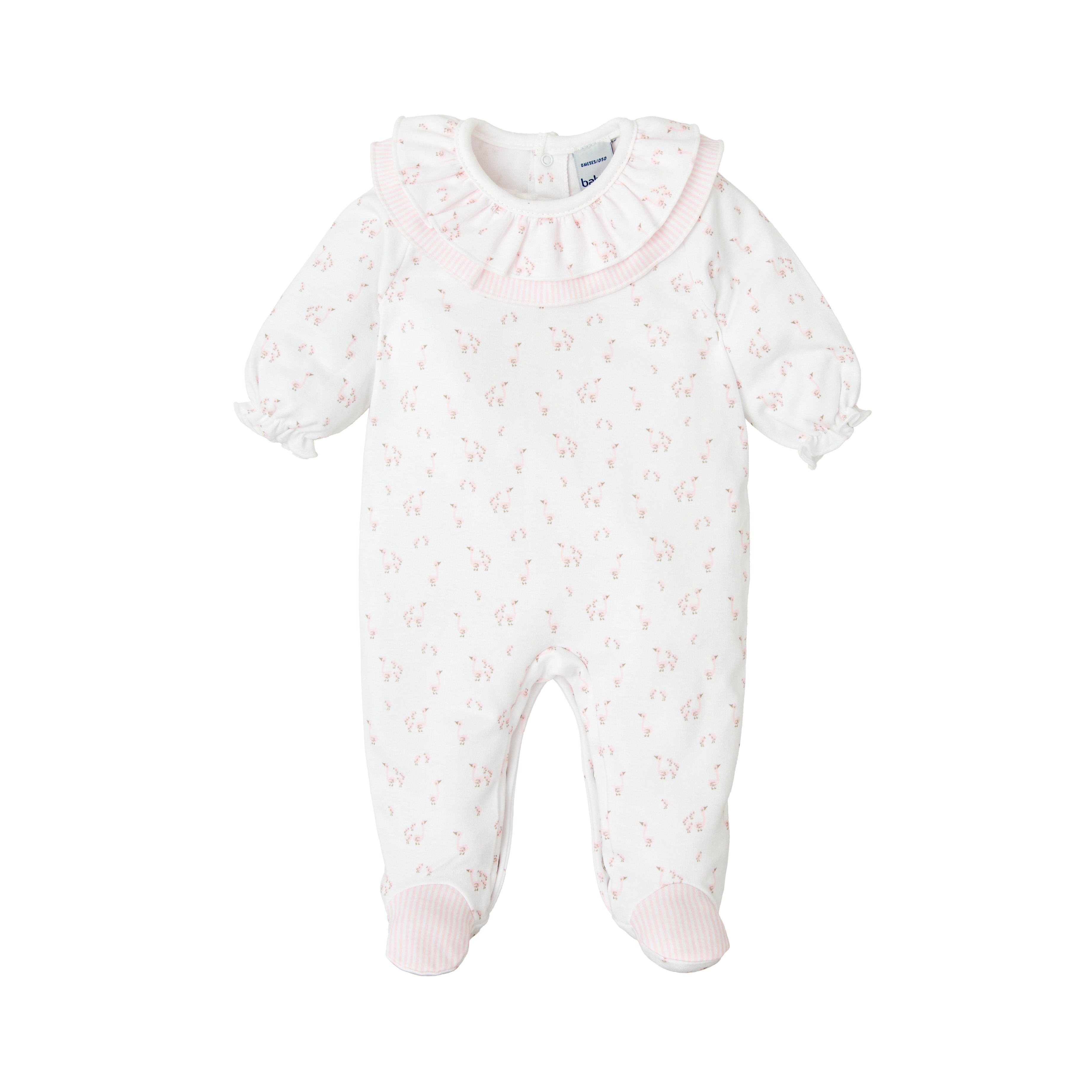 A soft cotton babygrow for your little one. This sweet colour and cute pattern makes this an ideal gift to celebrate the birth of a new baby girl. We love two-piece nature of these sets as they are ideal for longer babies