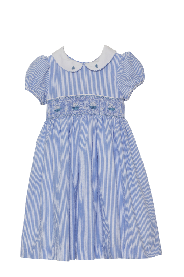 Beatrice is one of the most luxurious dresses in the collection. It is made from 100% blue and white stripe seersucker cotton and is hand smocked with delicate baskets across the chest. Beatrice also has hand embroidered rose buds on each collar and comes with a matching hairband.