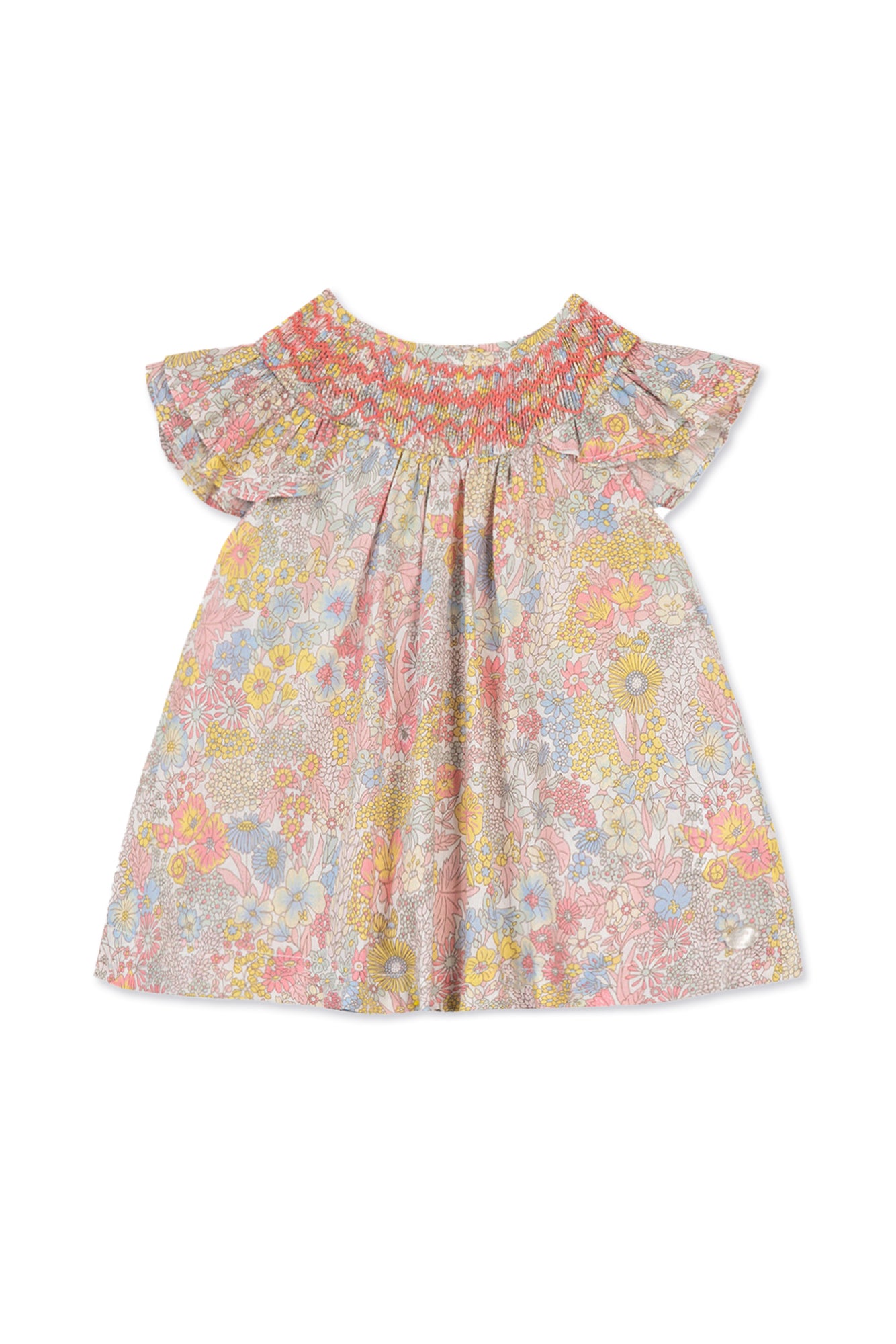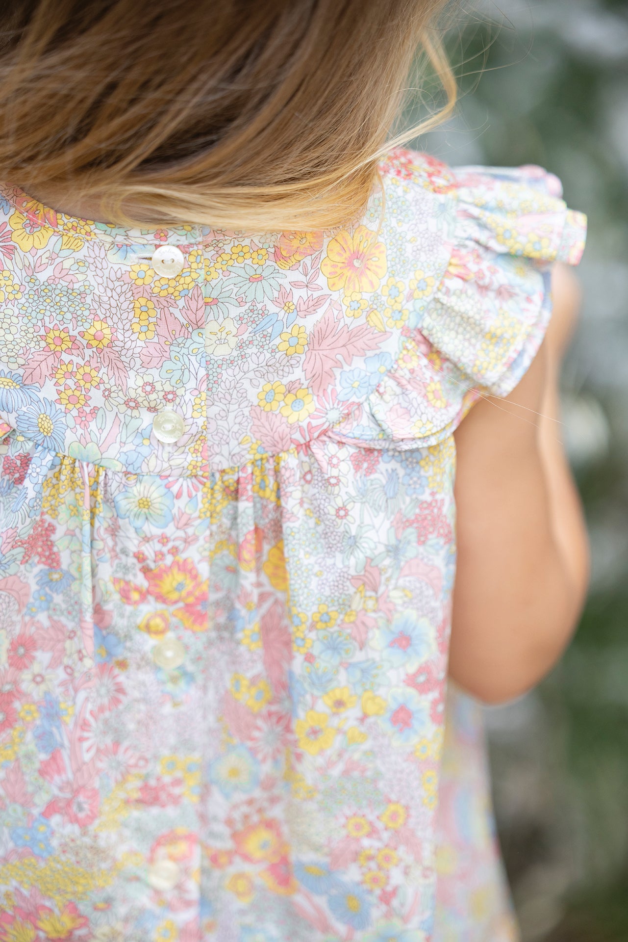 With delicate ruffle sleeves and a hand-embroidered smocked design, this liberty blouse is perfect for summertime.