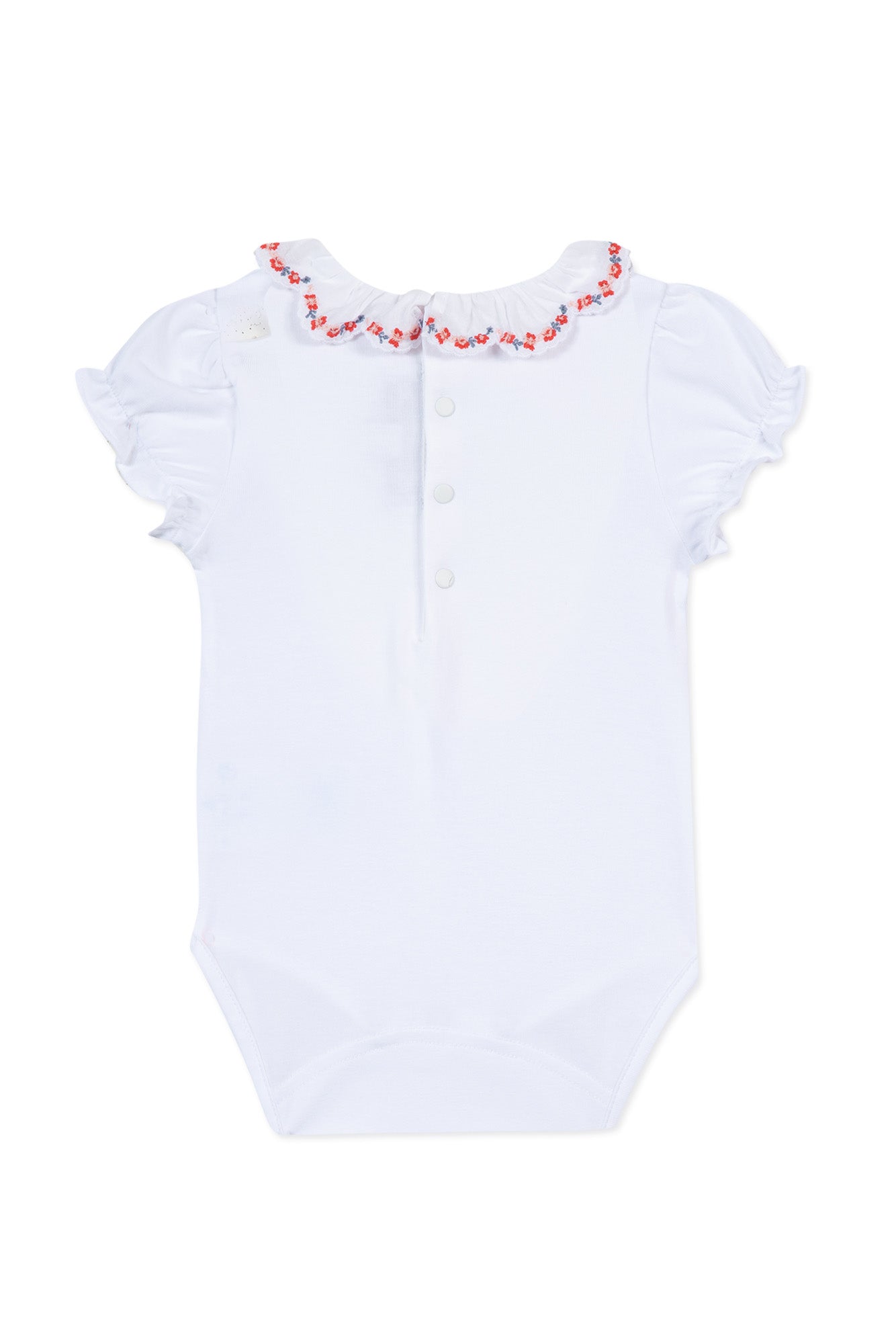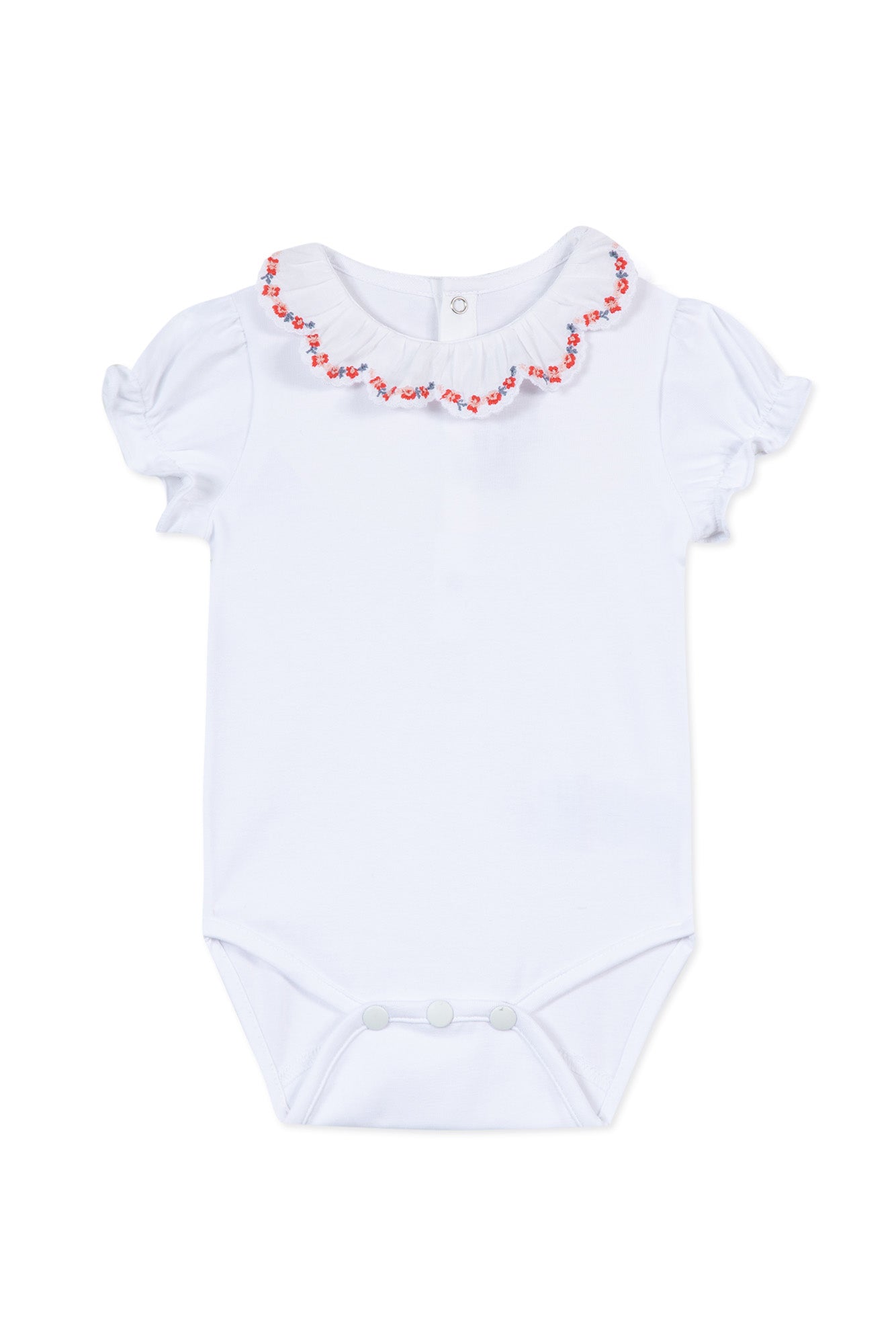 This bodysuit features delicate hibiscus flower embroidery on a soft white fabric. The short sleeves provide comfort and breathability for your little one. Dress your baby girl in this beautiful bodysuit for a stylish look.