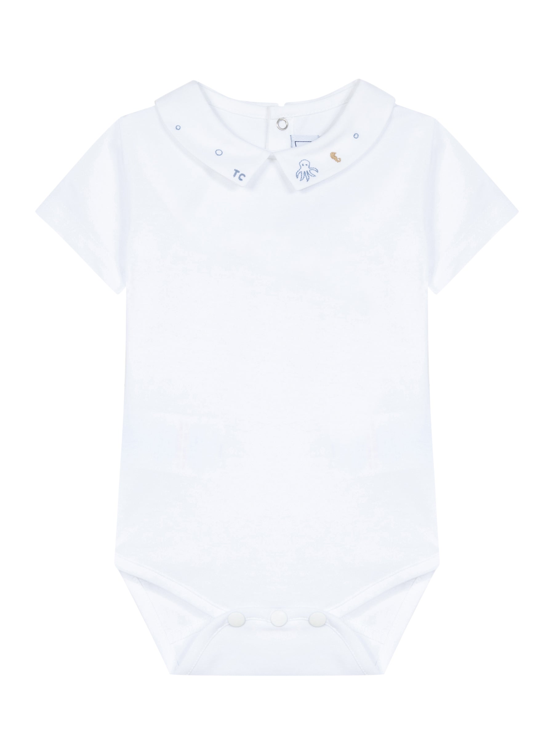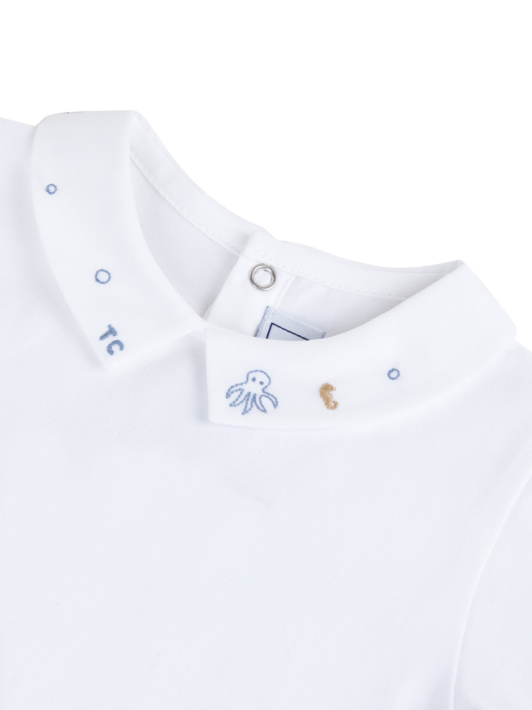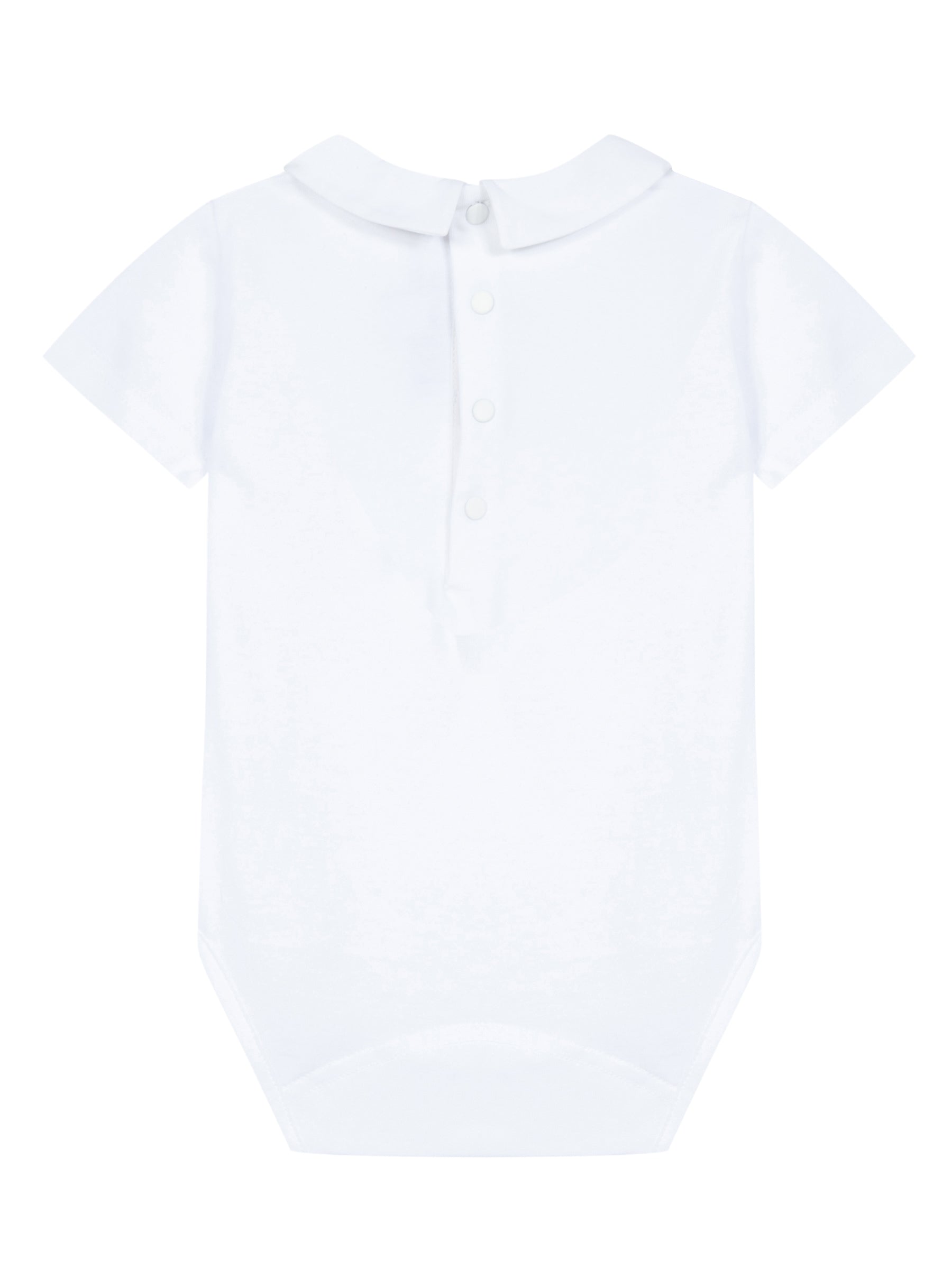 Specially designed with your little one’s comfort in mind in soft fabrics, this comfortable bodysuit is perfect for playtime. To make changing your little one’s clothes a pleasure, this bodysuit features press studs at the back and between the legs. The pointed collar and gorgeous embroidery add a modern, elegant touch to your little boy’s outfit.