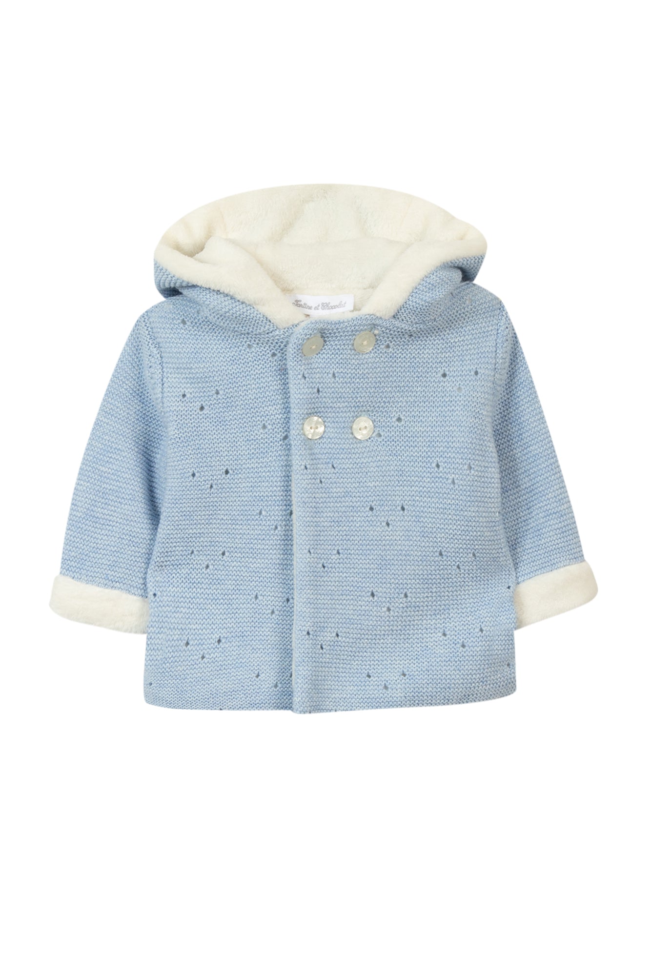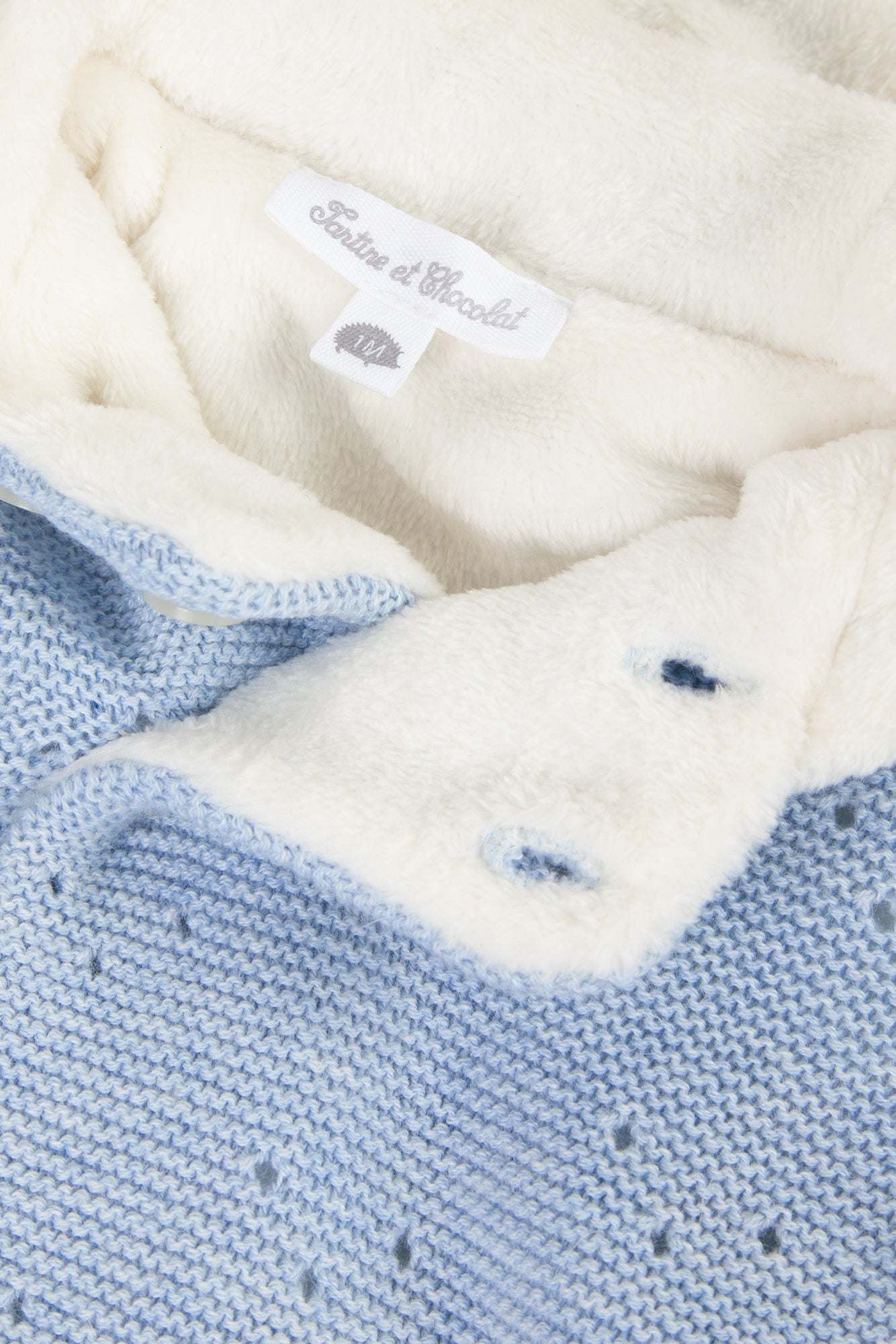 This garter-stitch coat is wonderfully soft. We love the double button tab, faux-fur lining and two pompoms on the hood. Perfect for keeping your little one warm. Ideal for everyday wear, we love pairing it with a babygrow or little outfit underneath.