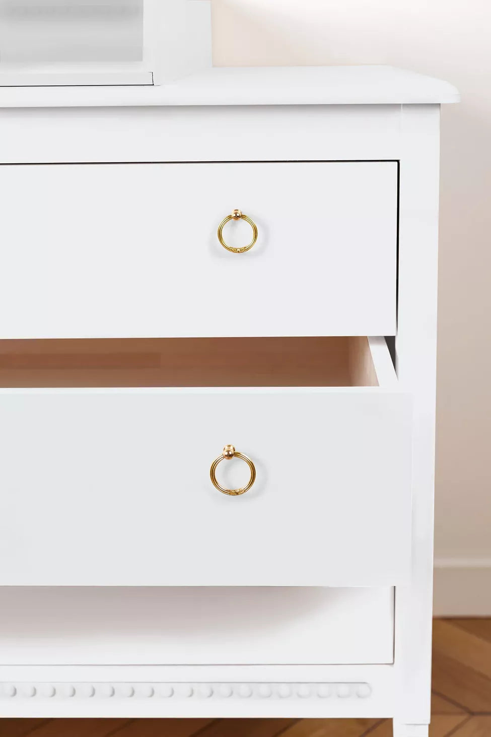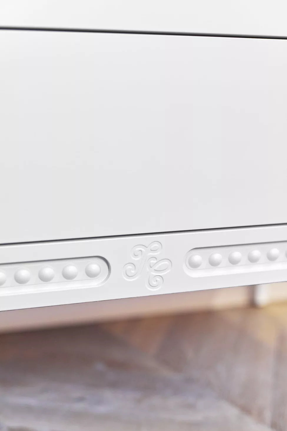 The perfectly chosen details are the object of a goldsmith's work with the pearls that draw the contours of each piece of furniture symbolising elegance and refinement. The chest of drawers with its sober and elegant design and its 3 drawers will fit perfectly in a child's room but also in a junior room.