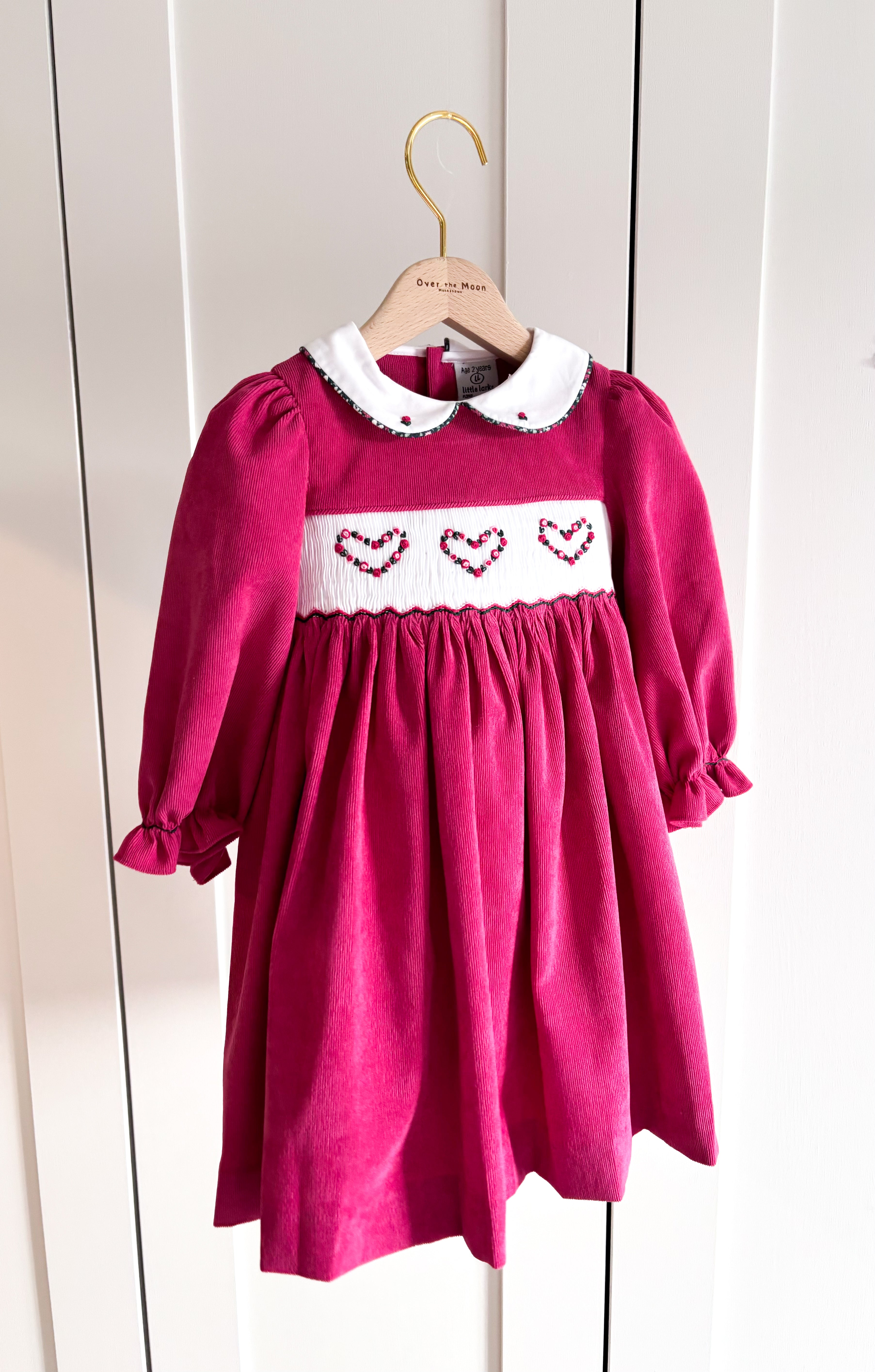 Claudia is a raspberry pink velvet/cotton dress with a white collar and scallop detail in it's hand smocking.