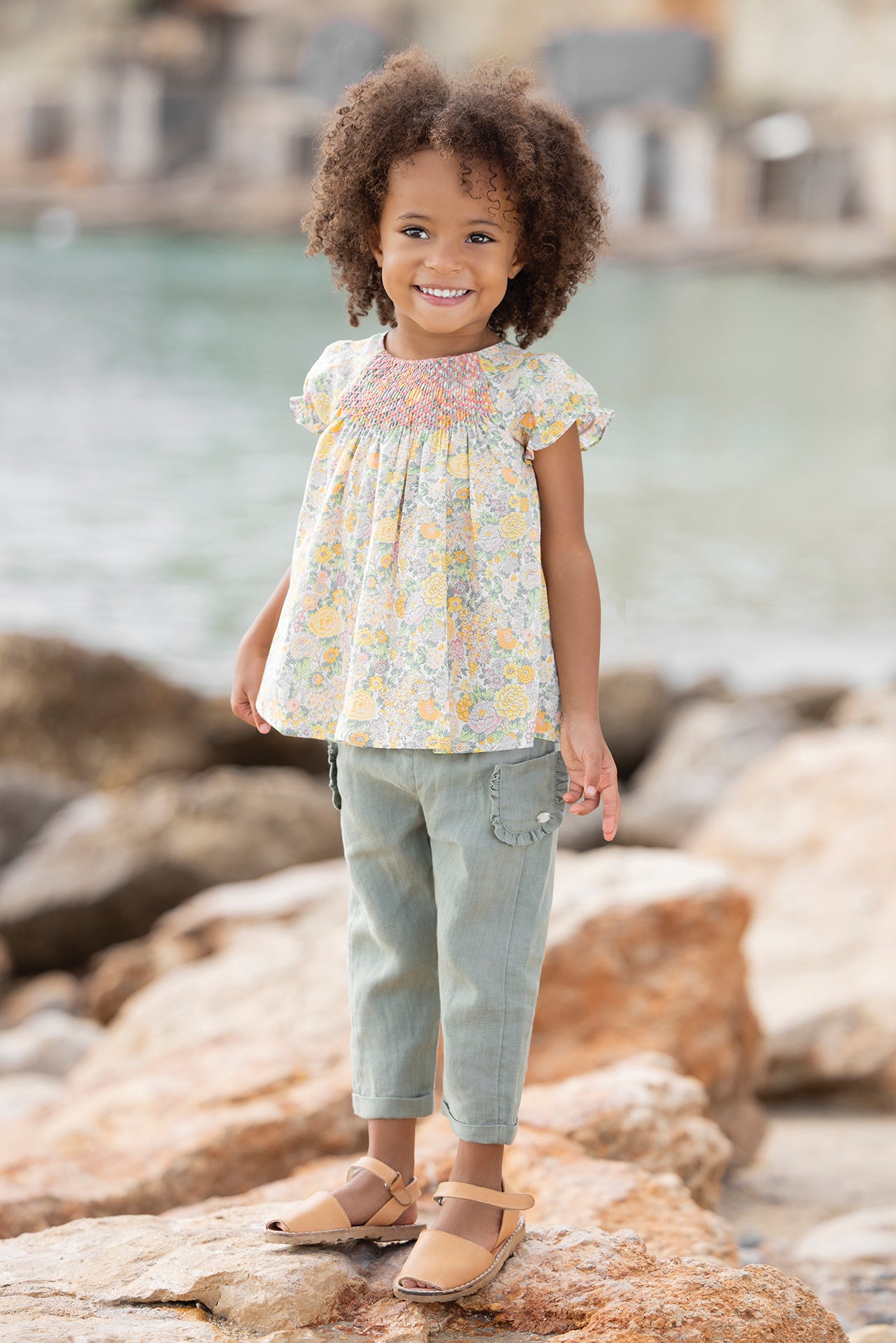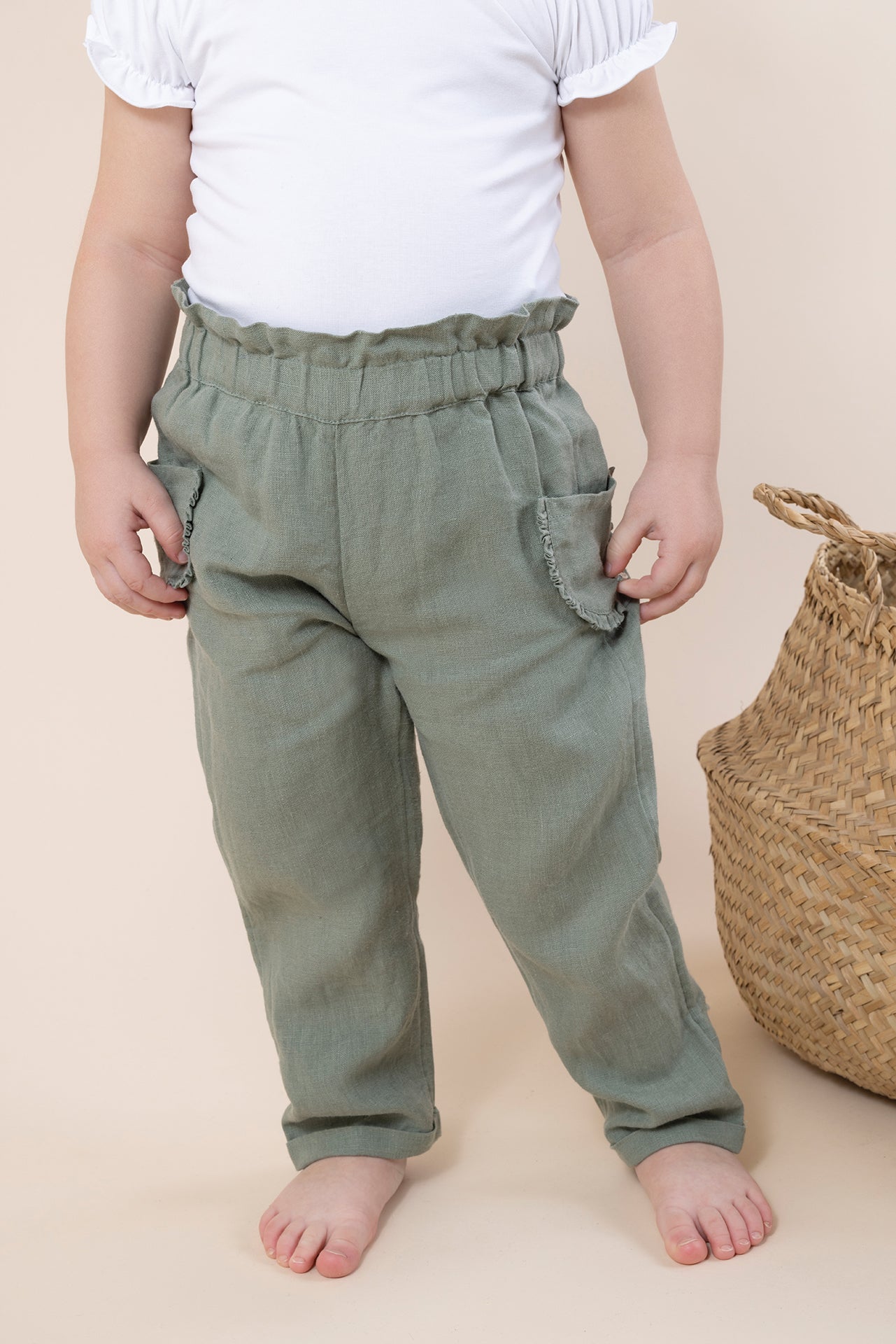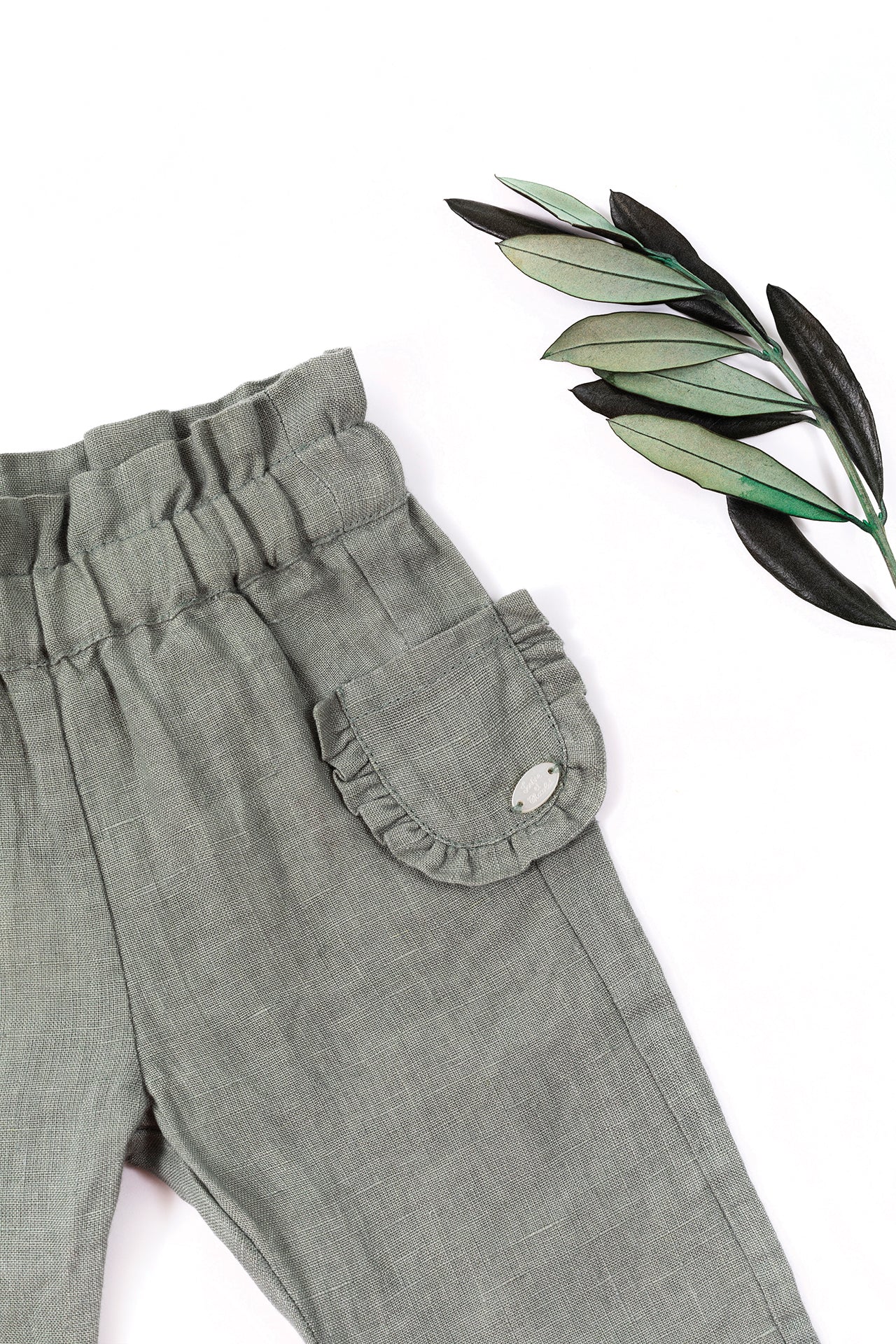 These trousers with ruffled details and its 100% linen material that will bring lightness and spring softness to little girls' outfits.